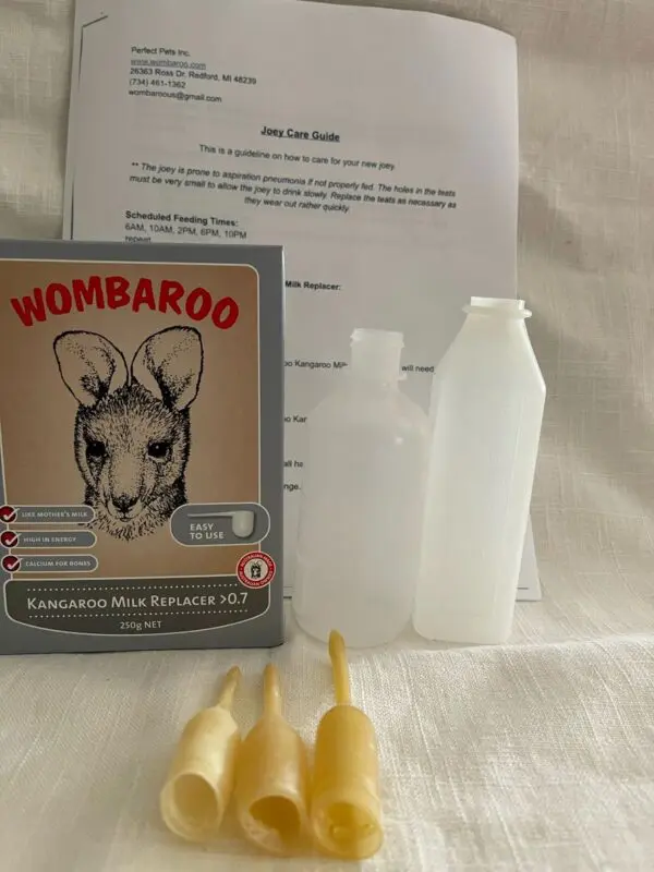 This package supplies you with the necessary tools to care for your joey out of mother’s pouch.